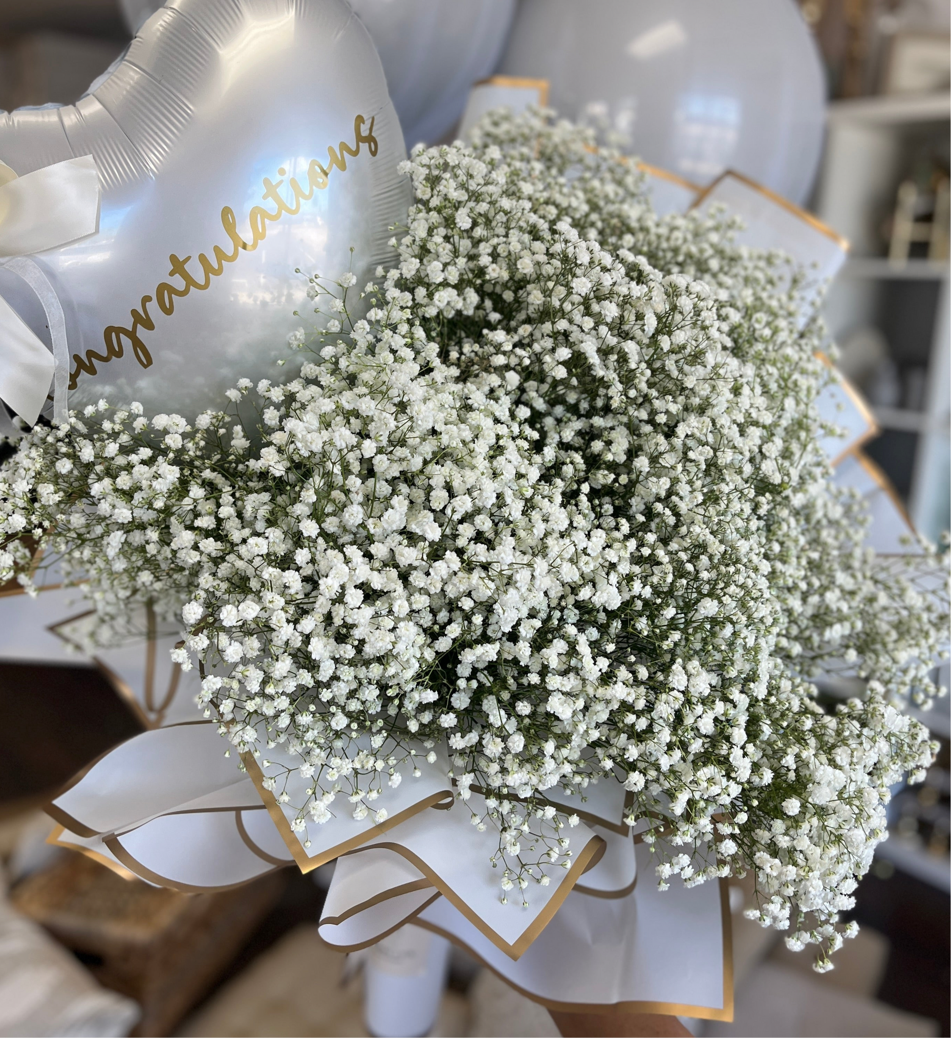 Hand tied flower bouquet of babys breath with a personalized heart 18” foil Balloon
