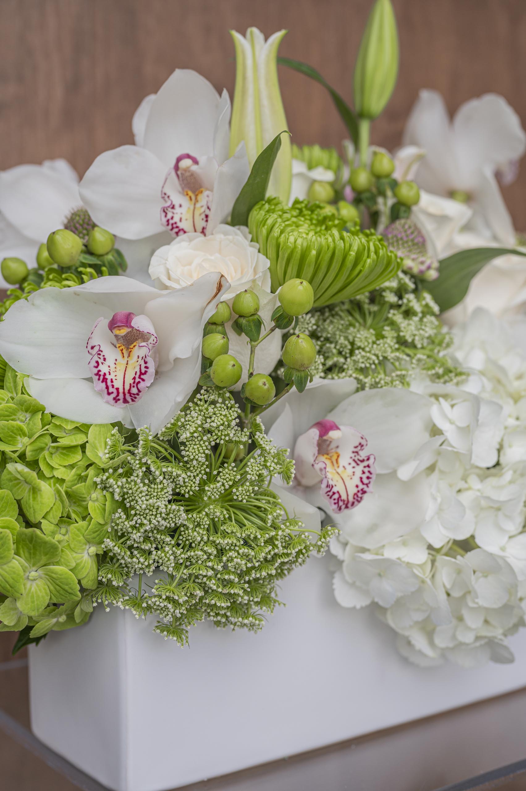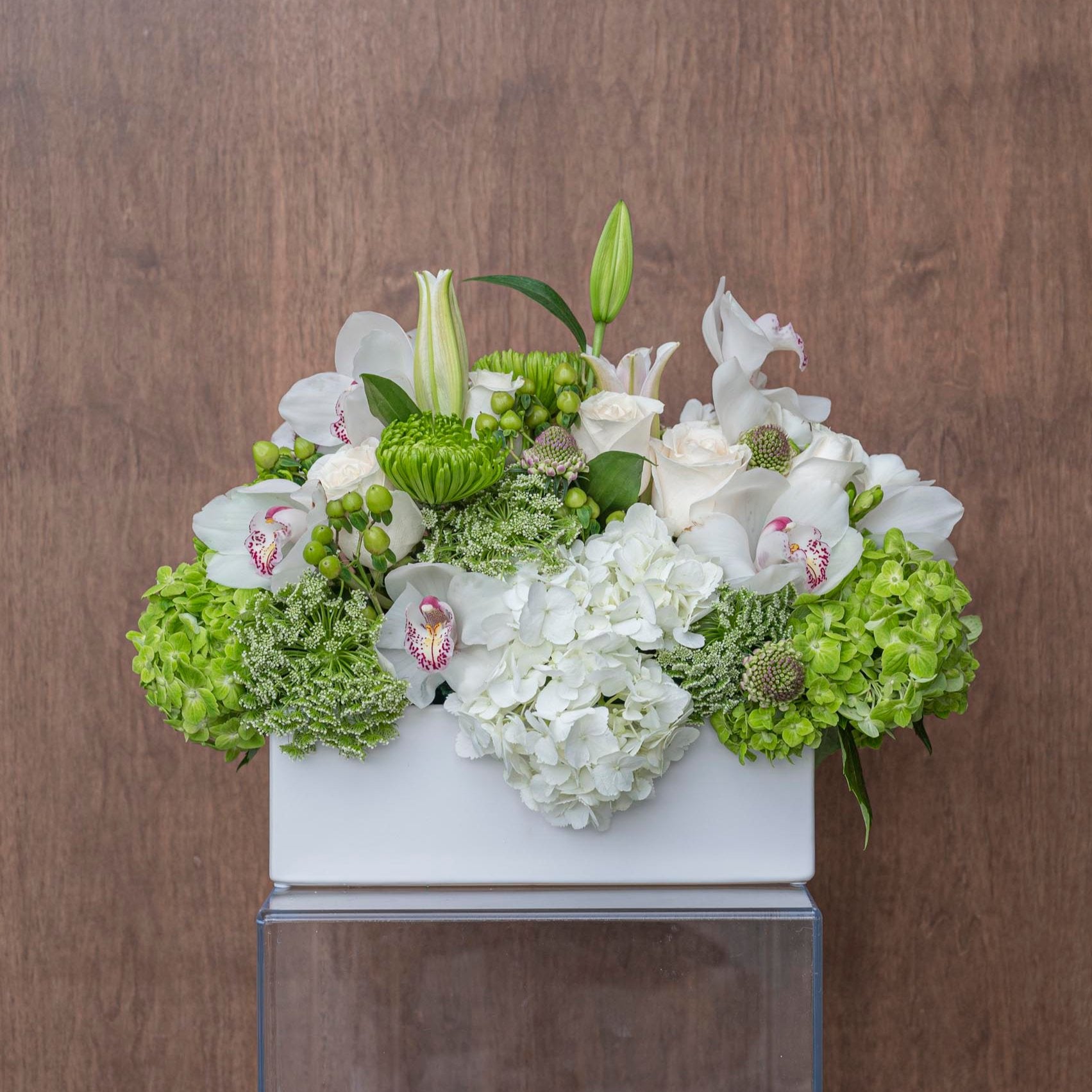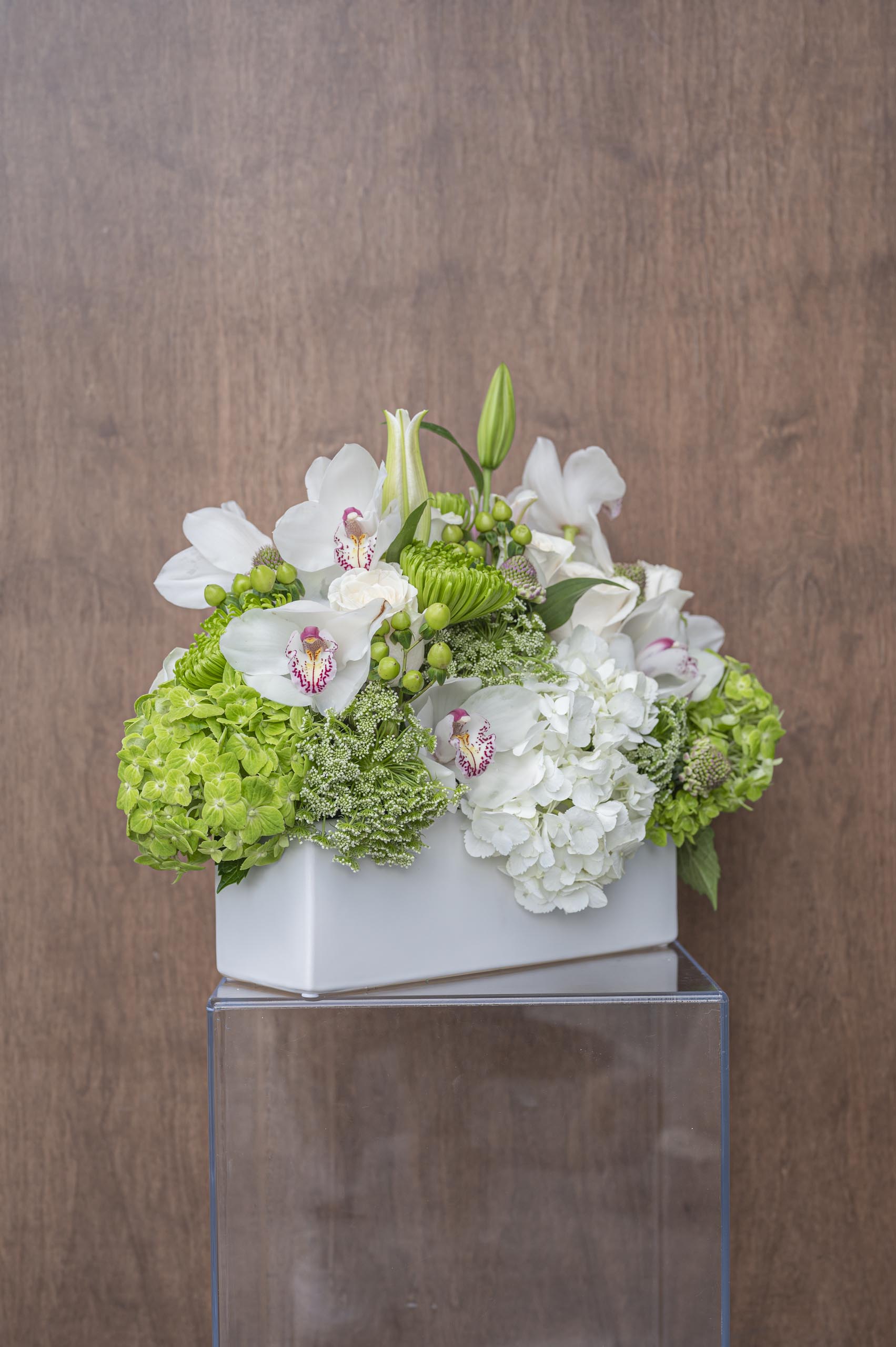 Our beautiful centerpiece in a rectangular ceramic vase