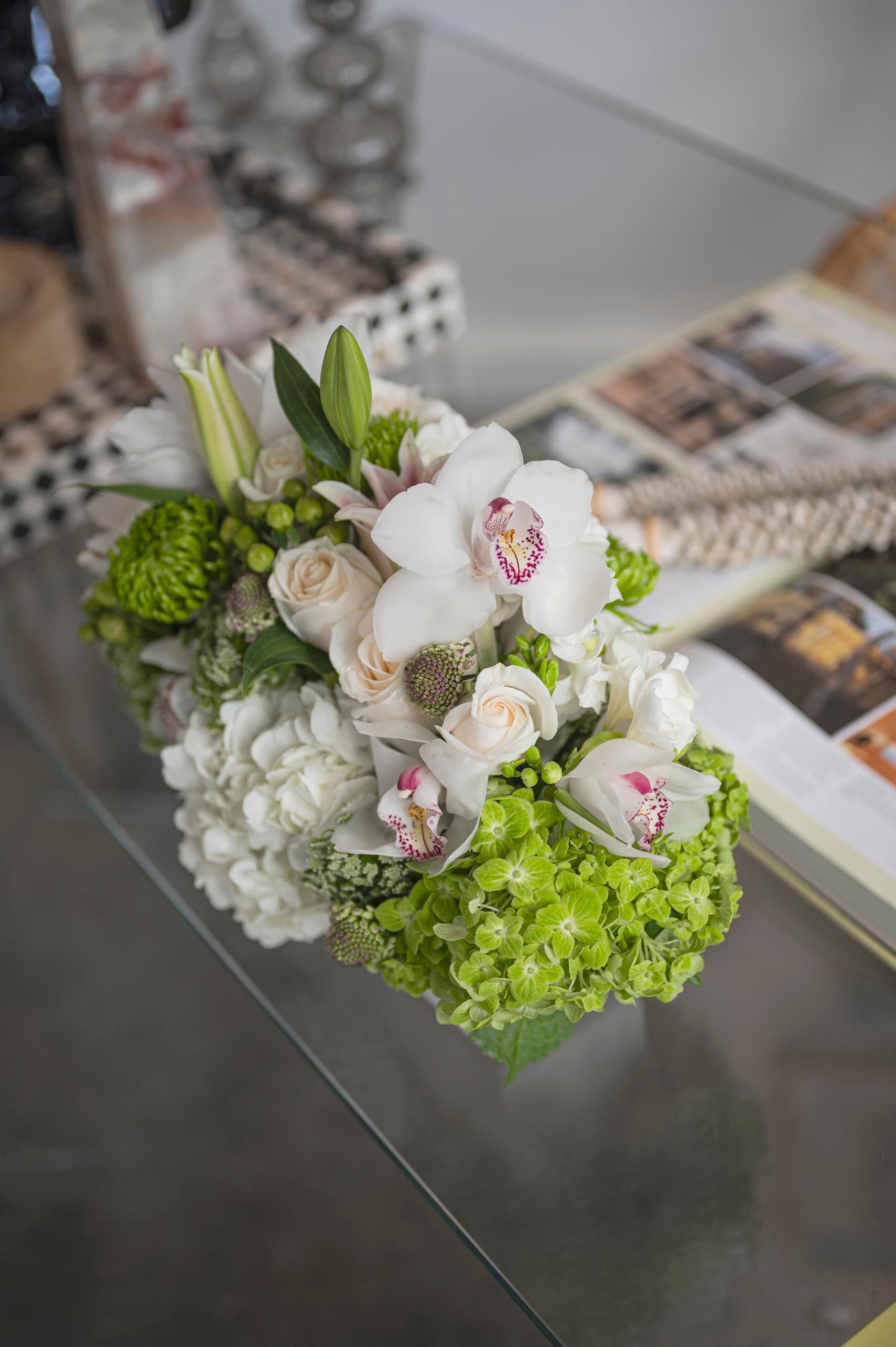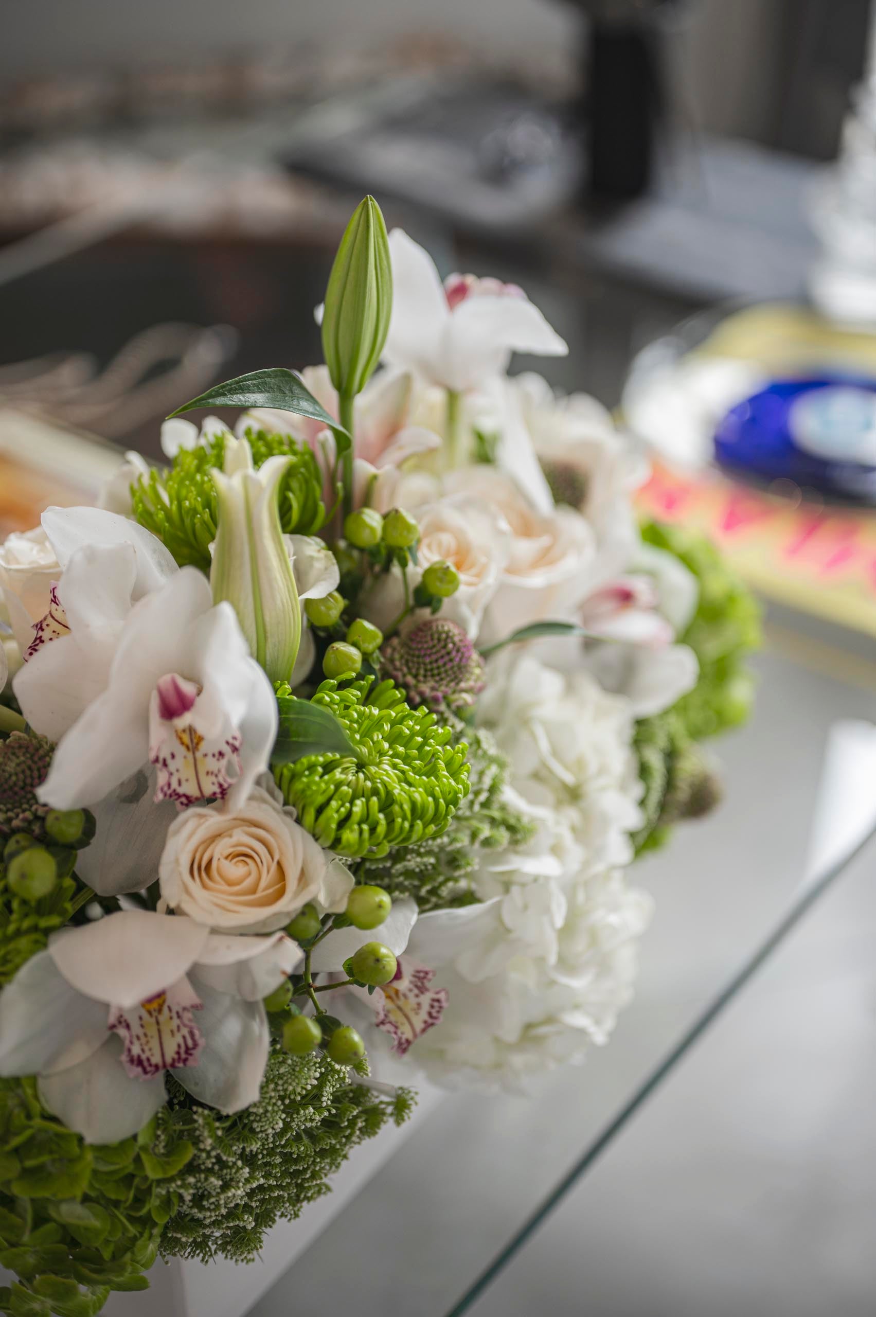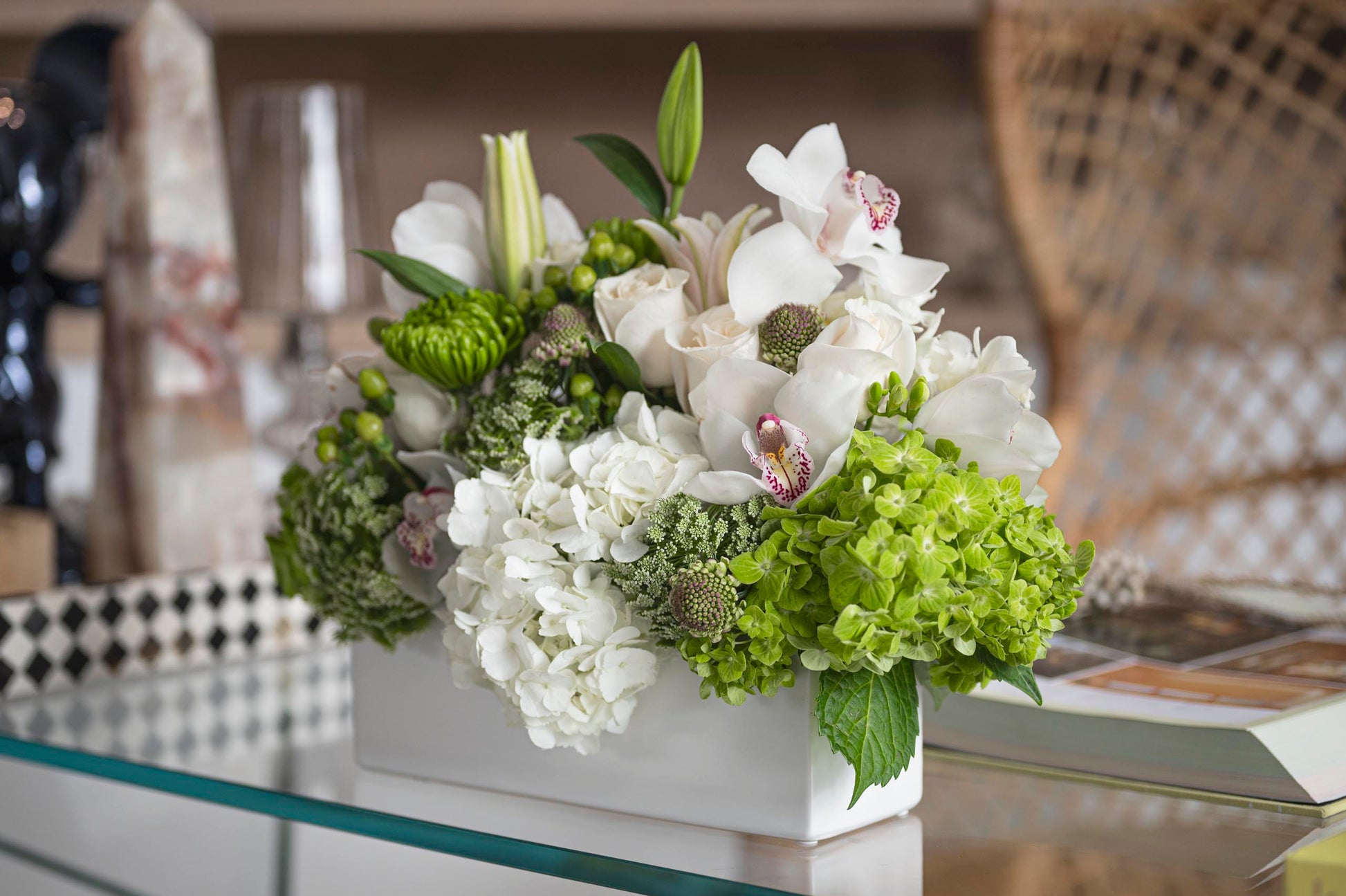 Our beautiful centerpiece in a rectangular ceramic vase