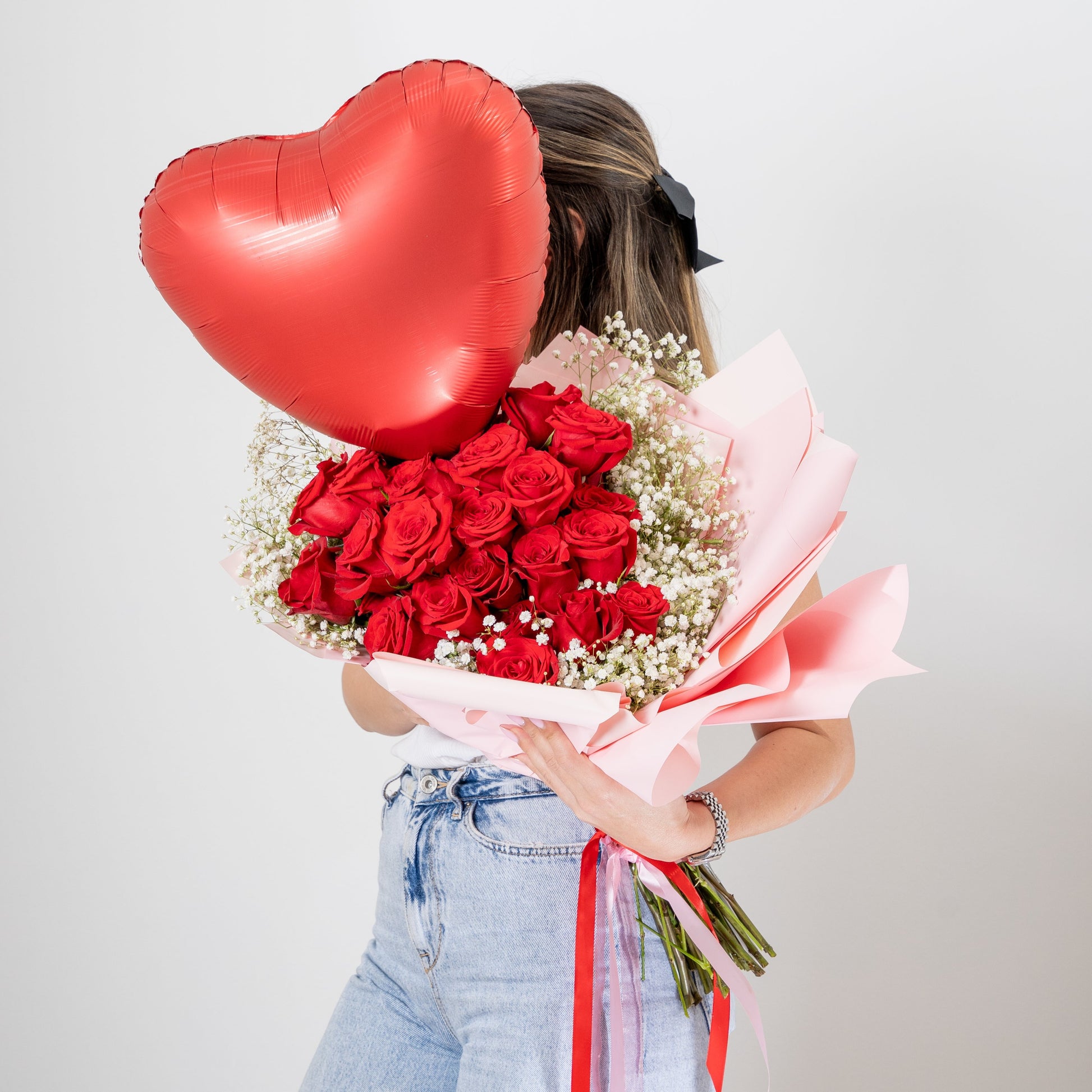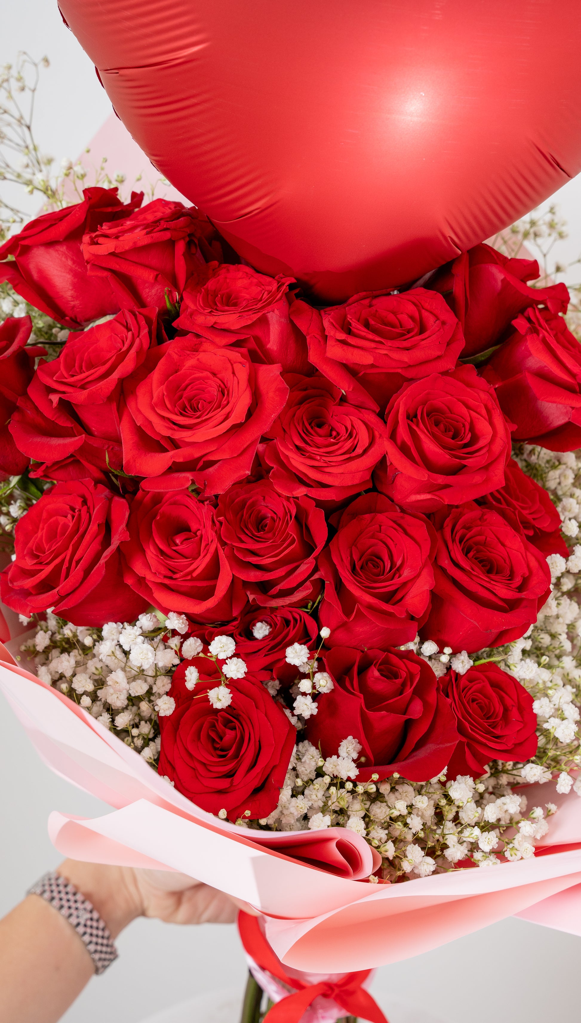 Roses and baby's breath never looked better together, and will certainly charm those fortunate enough to receive them! Add a heart balloon with personalized printing (ex. I Love You) for the perfect touch!
