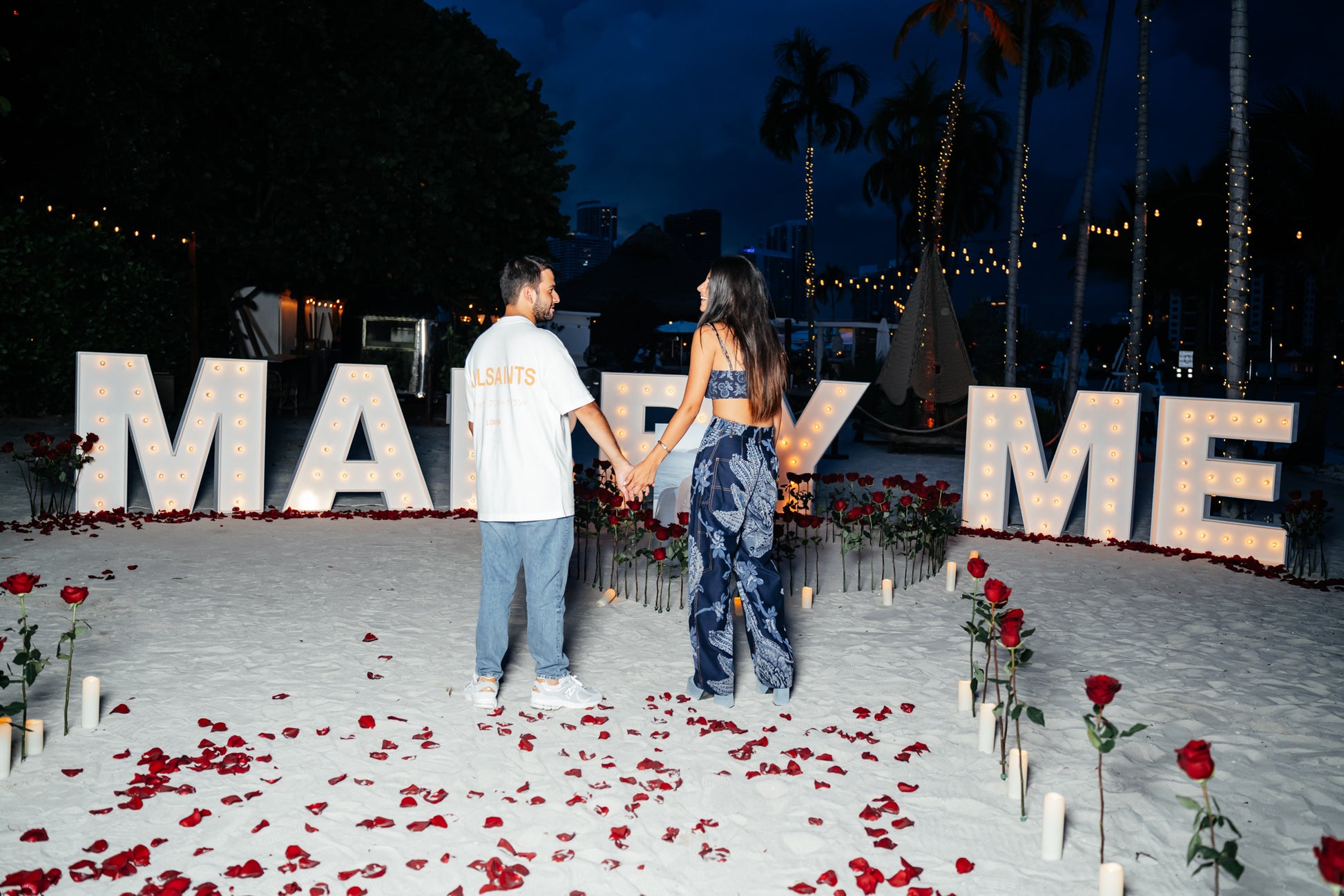 Let's Make Magic: Your journey starts with a vision, and we're here to breathe life into it. Imagine the "Marry Me" letters glowing as bright as your futures, roses whispering promises in the sand, and us standing by, making your romantic symphony come to life.