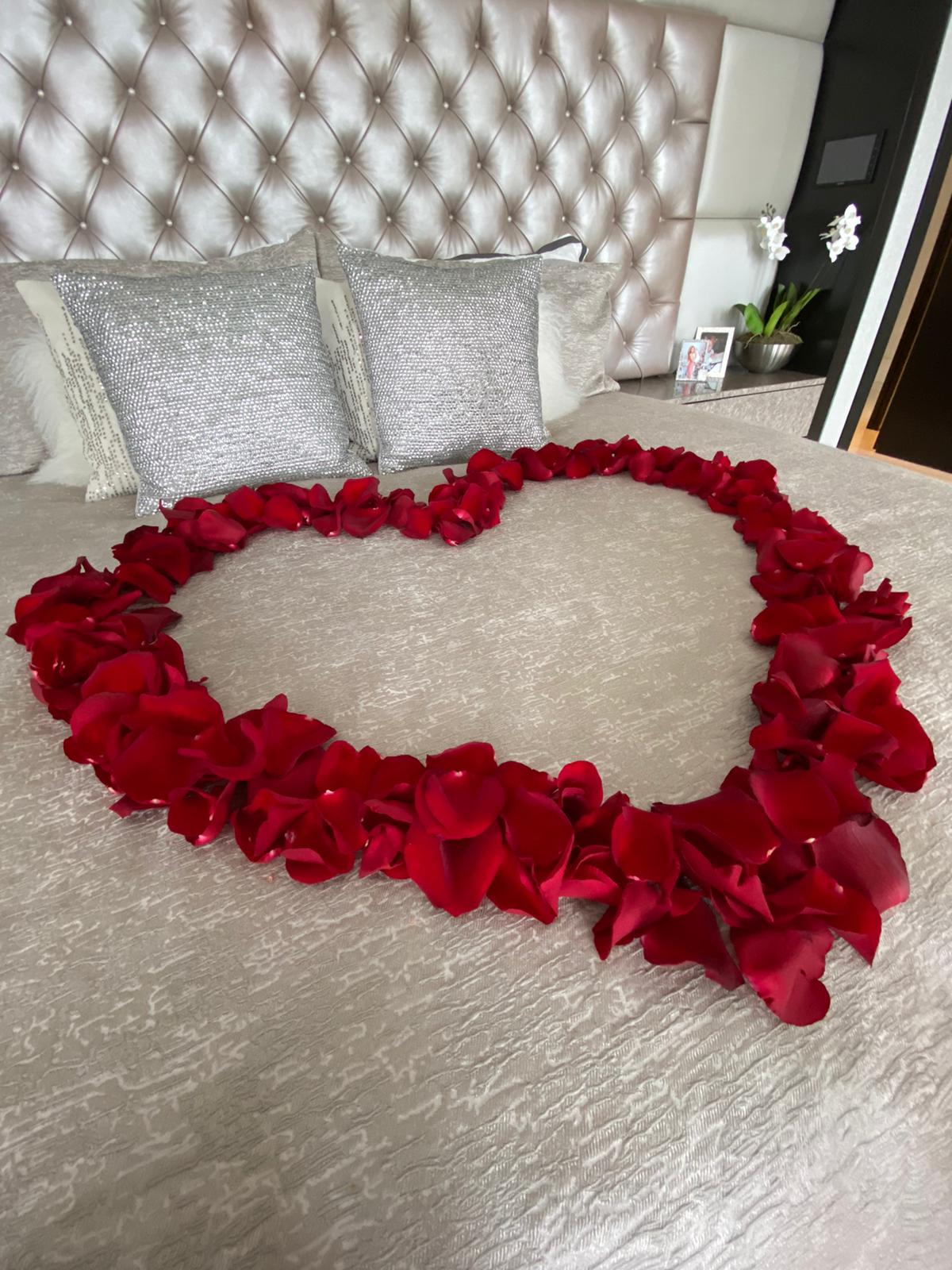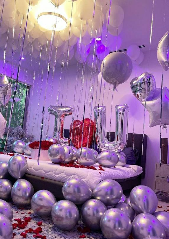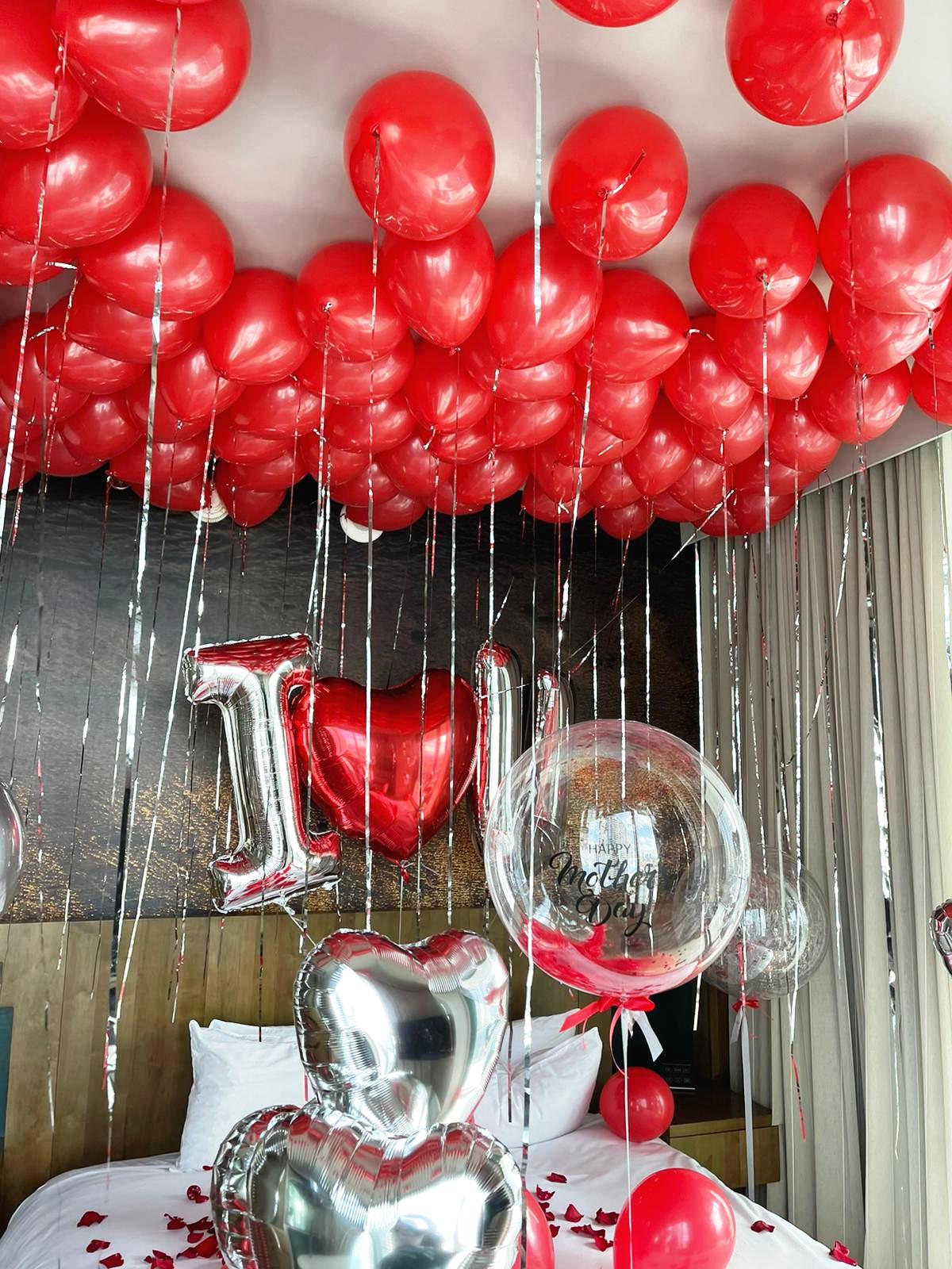 Just imagine how your special someone will feel when they walk up into a room decorated with 50 helium latex 11" balloons on the ceiling, 10 air balloons all over the bed, 6 romantic heart shape balloons scattered around the room, an "I ❤️ U" balloon sign and, last but not least, fresh rose petals decoration.