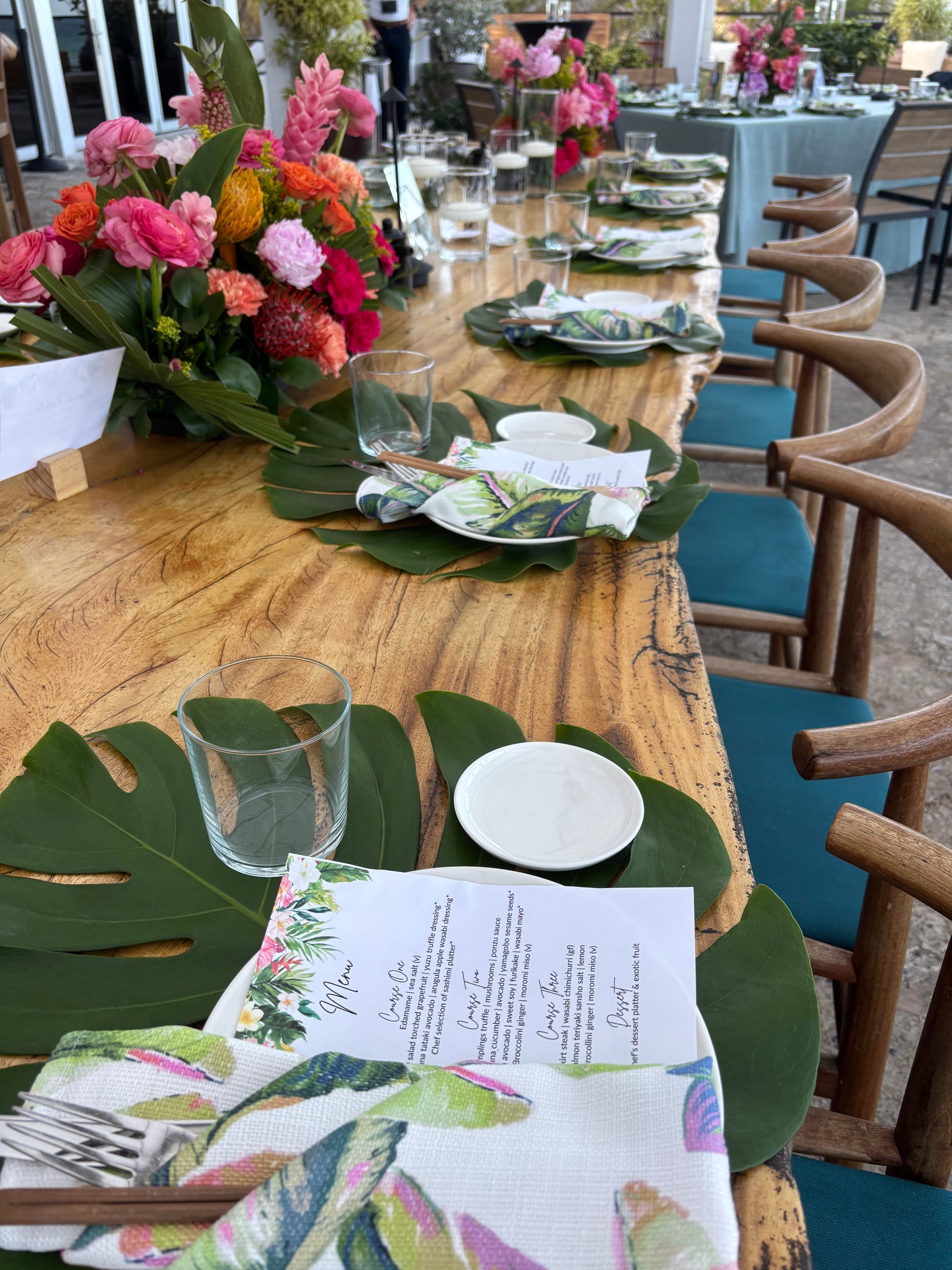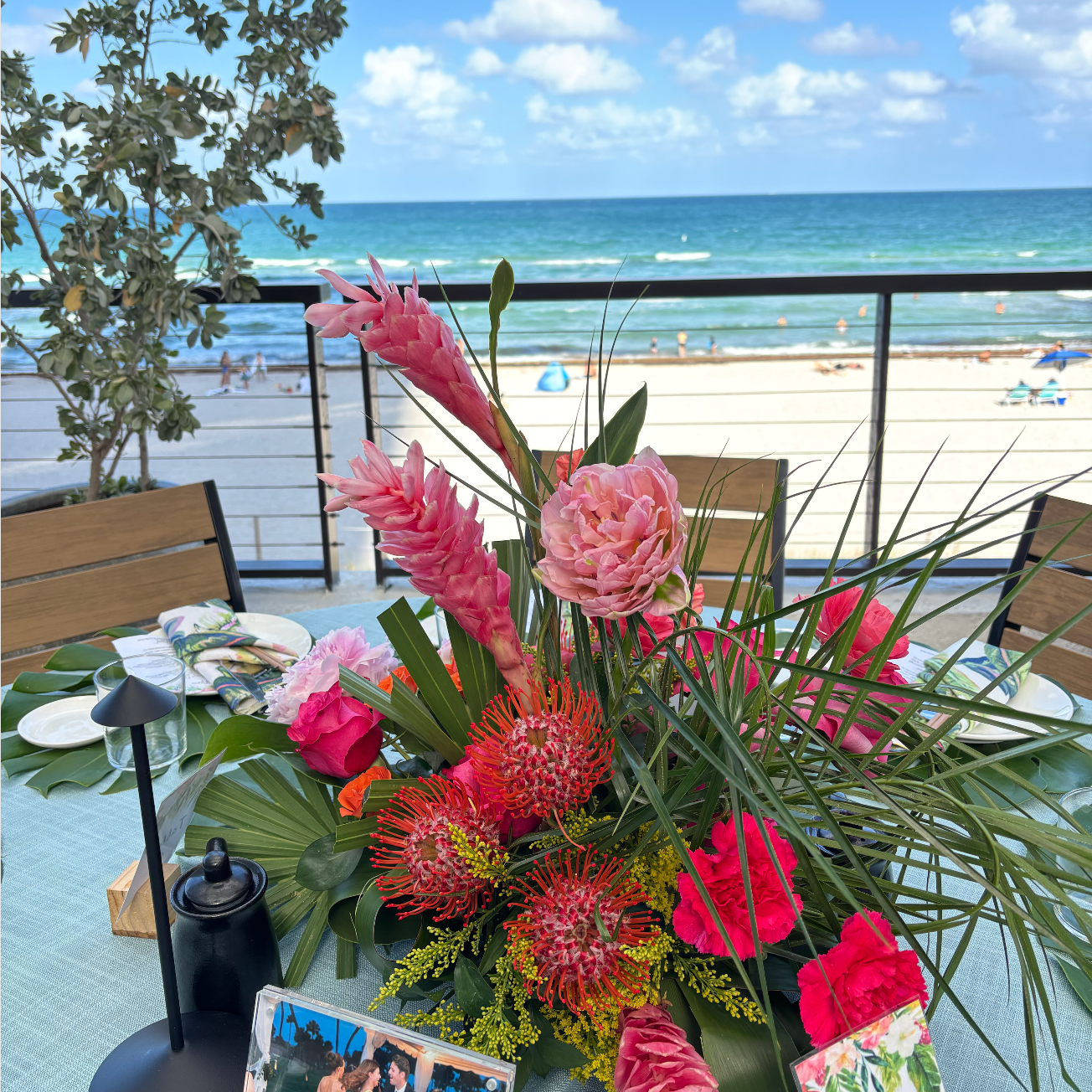 Assorted Tropical Florals and greens flat on an oasis platform.